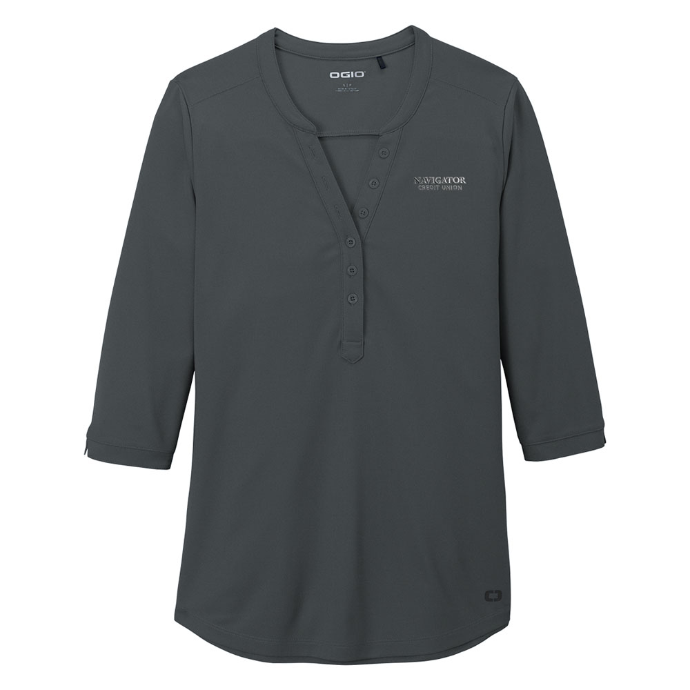This modern henley combines smart style with performance, crafted from 5-ounce, 100% polyester pique featuring stay-cool wicking technology. It's designed with a 6-button Y-placket with dyed-to-watch OGIO buttons (top three decorative), set-in open hem sleeves, and finished with an O heat transfer on the left hem.